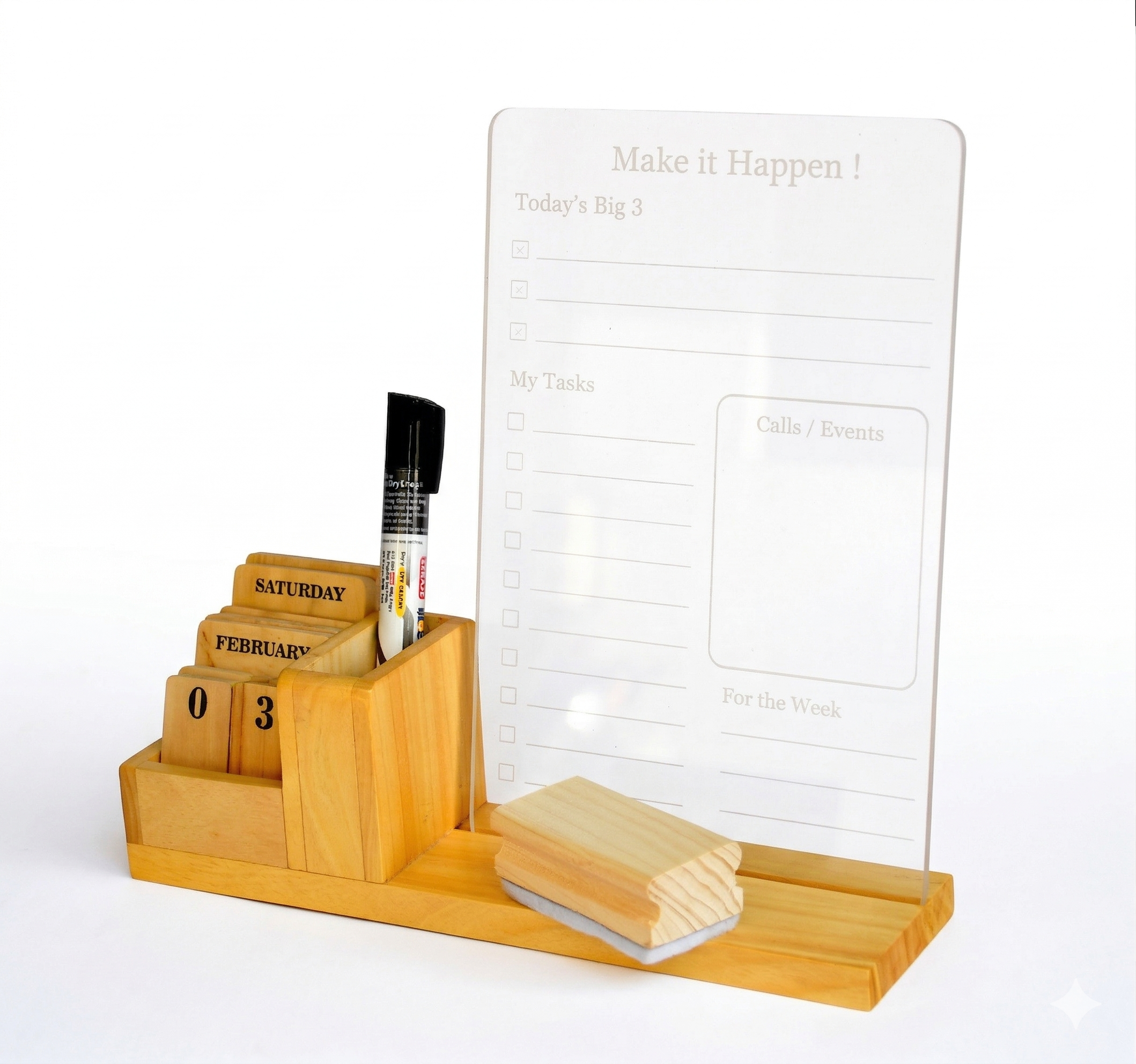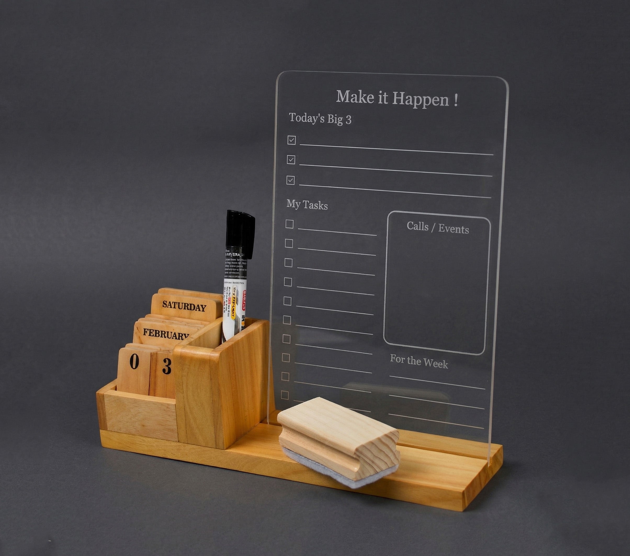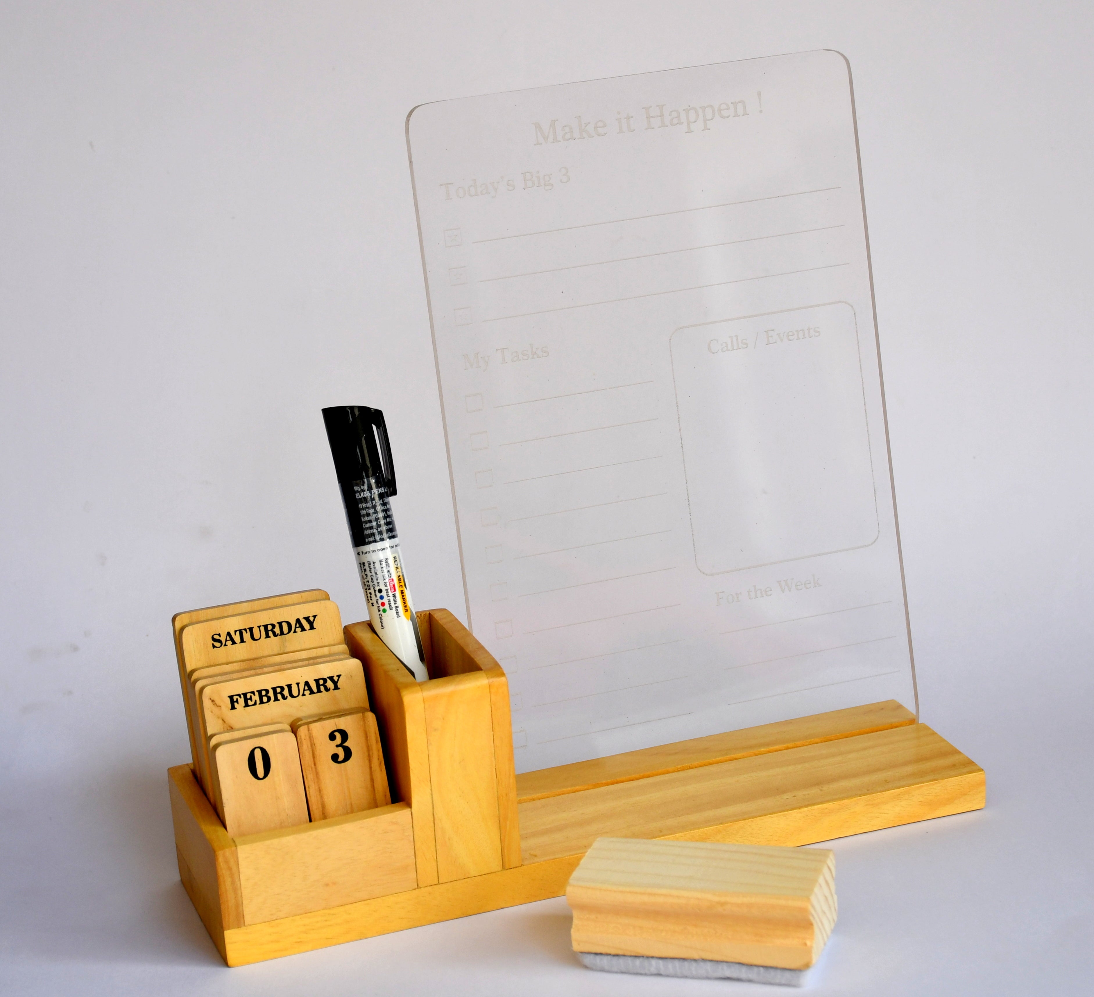 ALL-IN-ONE DESK ORGANISER – Combines acrylic planner board with wooden pen holder and calendar blocks.