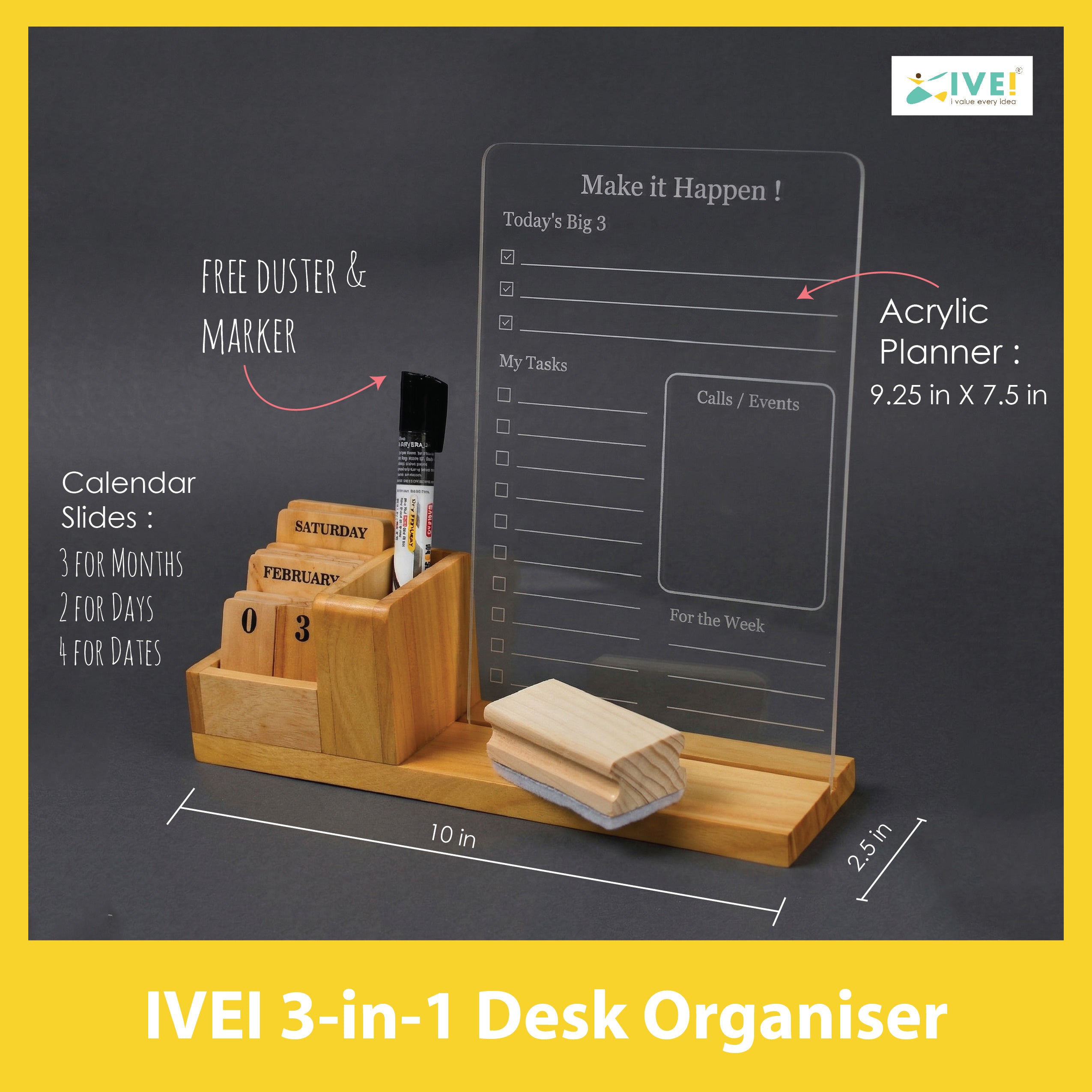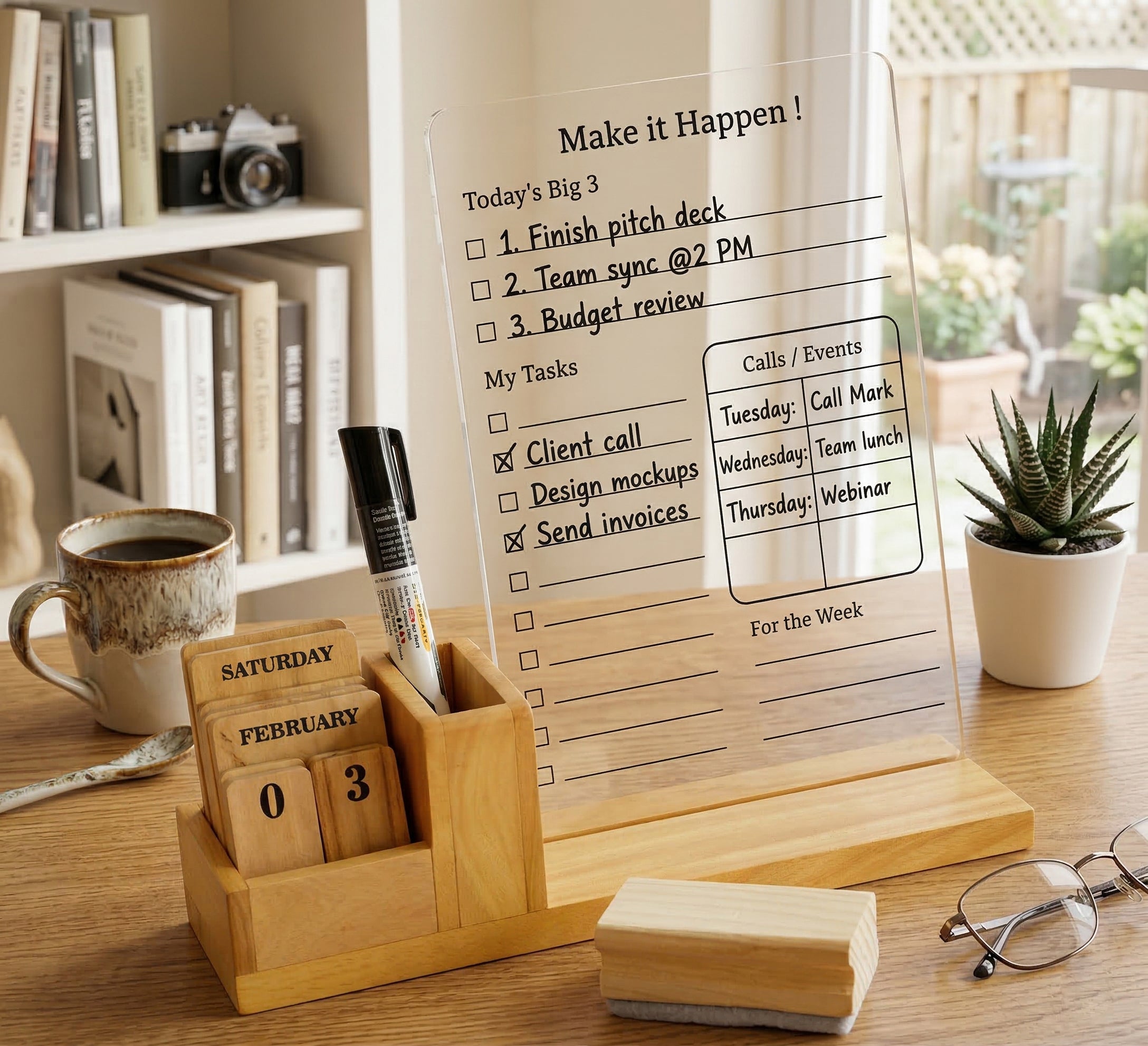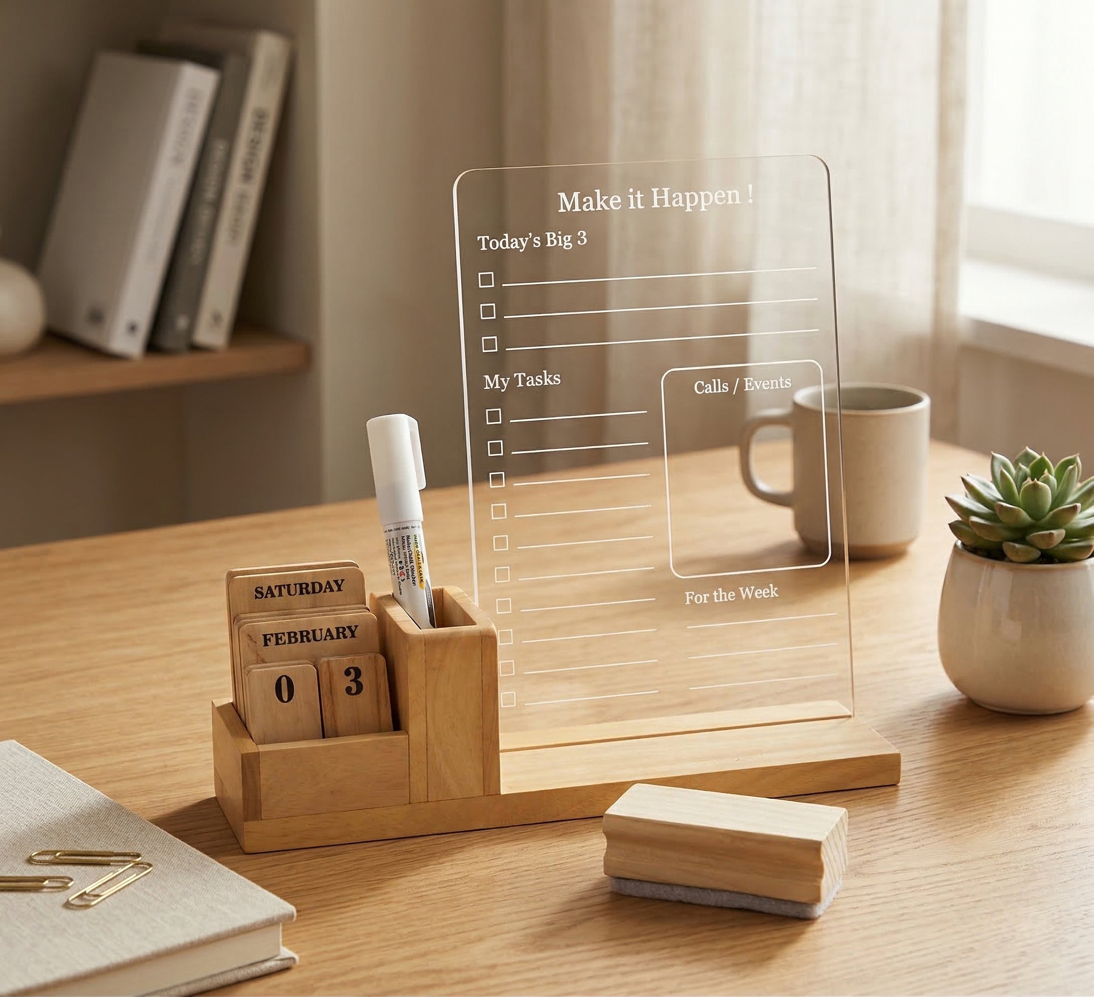 ALL-IN-ONE DESK ORGANISER – Combines acrylic planner board with wooden pen holder and calendar blocks.
